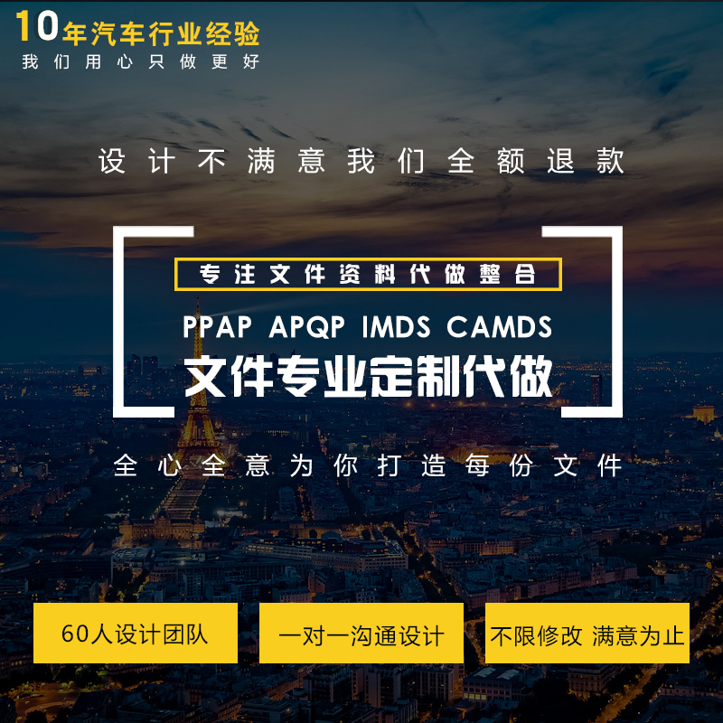 專精于五金件、注塑件、緊固件,特殊加工零件,汽車零部件等產品的PPAP、IMDS、CAMDS、FMEA、8D報告等技術文件輔導制作服務。